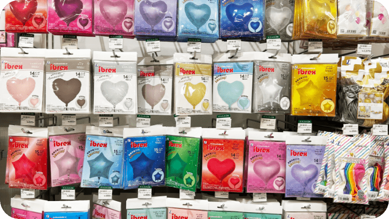 小分のパッケージ入り風船セットや、バルーンポンプ等の関連アクセサリーも揃えて初めての方でも安心して選べる陳列内容です。島上にはヘリウム入りバルーンも膨らませ店内も明るい雰囲気にし、コーナーのアイキャッチにもなります。